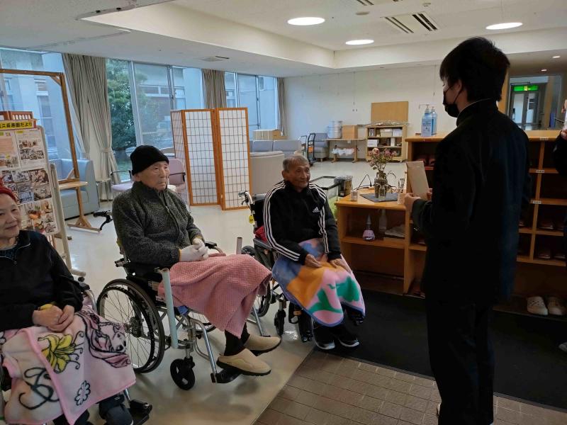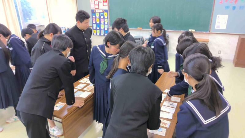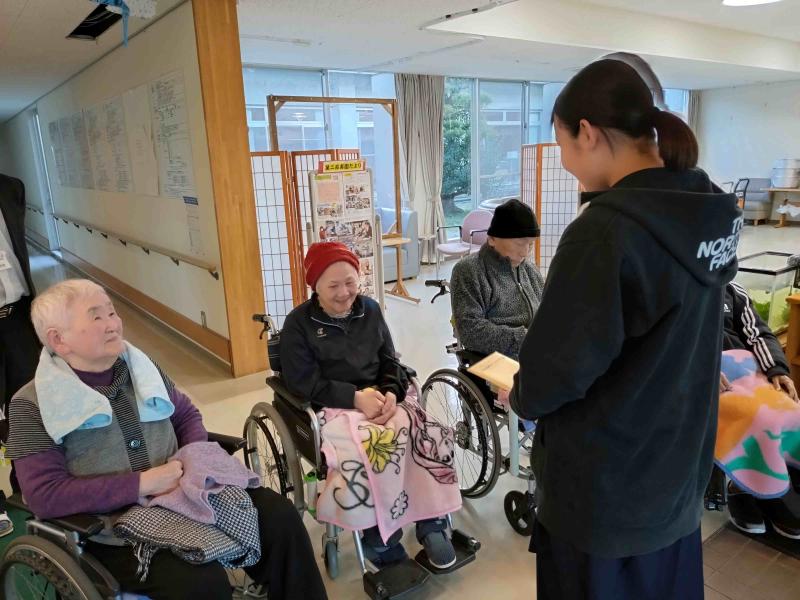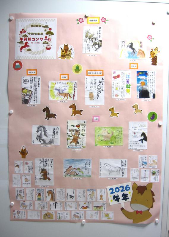 松波中学校では、毎年地域のお年寄りの皆さんに年賀状を送っています。今年も校区内にある第二長寿園の皆さんの健康を祈って、年賀状を書きました。手書きのものが少なくなっているからこそ、気持ちを込めて1枚1枚丁寧に仕上げていました。校内コンクールも兼ねて行い、図書文化委員が審査して入選したものは玄関に掲示しています。(実物はお渡ししたので、スキャンしたものです)投函することのできるのですが、図書文化委員で直接お伺いし、渡してきました。~良いお年をお迎えください~