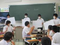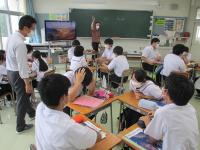 本日はALT(英語指導助手)のマルさんと英語科教諭との2人体制の授業です。マルさんから出されたお題を,NGワードを使わずに解答者に答えさせる学習でした。同じグループの3人のヒントから正解を連想するのですが,一人のヒントが10秒間と短く区切られ,ヒントを出す方は必死に考えて伝え,答える方は必死に聞き取り理解しようとしていました。珍解答もありましたが,正解には拍手が沸き起こっていました。