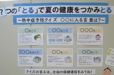 7月に入り,熱中症対策も必要になっています。写真は,熱中症予防クイズです。〇〇に入る言葉はわかりますか? 実行できていますか?