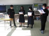 有志発表では,生徒たちの普段の学校生活では見せない一面やPTAのルパン劇場(職員も参加しました…)で大いに盛り上がりました。学年発表で1年生は『ノットリンとのとっしー』が主人公の里山里海の豊かな資源を知るクイズ劇,2年生は自分を見つける中学生が主人公の劇『Alice』に取り組みました。3年生は能登町の『ミライデザイン会議』でそれぞれのグループが方策を発表し,1・2年生が投票で優秀賞を決めました。プログラムの最後は,各学年の合唱で締めくくりました。