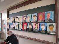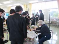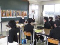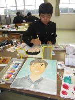 日本藝術院会員,日展顧問,光風会理事長を務められている藤森兼明先生と金沢学院短期大学准教授 児島新太郎先生をお招きして,3年生が自画像に挑戦しました。まずは,橋本さんをモデルに自画像の書き方についてお話しを聞きました。藤森先生の優しいゆっくりとした口調に最初は戸惑っていたようですが,だんだんと目が真剣になっていきます。次は手鏡を使って自画像を描いていきます。短い時間に全員が作品を仕上げ鑑賞までできました。生徒たちを引き付ける力,まさに『ほんもの』が持つすごさだと感じました。 最後は先生の作品をあしらった絵葉書に,ちゃっかりサインをもらっていました。