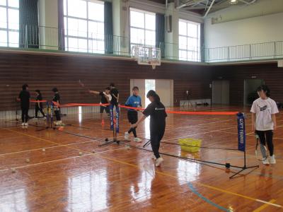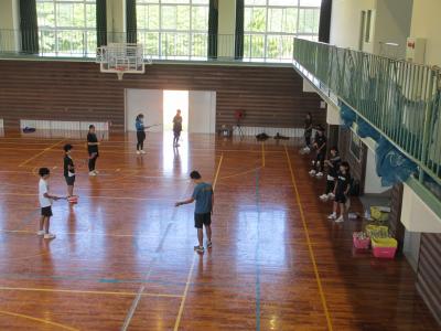 部活動を再開しました。あいにくの雨のため、外で練習予定だった野球部とテニス部は体育館を半分ずつ使用して練習しました。