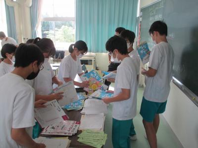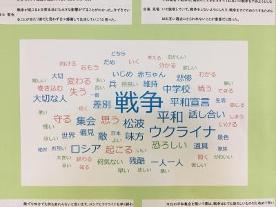 生徒会主催の平和集会では、谷川俊太郎さんの絵本「へいわとせんそう」を題材に自分たちが考える平和の大切さについて、「夢を叶える」「自由・健康」などのキーワードで話し合い、「松中平和宣言文」を読み上げました。