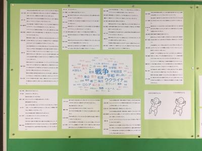平和集会に関する掲示物が生徒玄関に貼りだされていました。「メンチメーター」というツールを使って、生徒感想でよく使われたキーワードの掲示もありました。