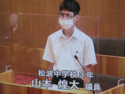 23日火曜日、能登町役場議場で「能登町子ども議会」が開かれました。松波中からは、小原千佳議員と山本煌大議員が質問に立ちました。
