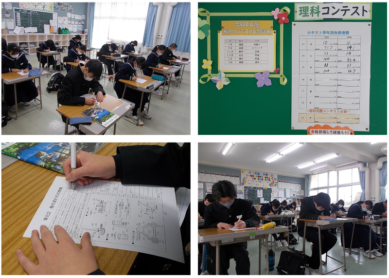 本校では、2学期から月1回程度、各教科のコンテストを実施しています。3月は、今週から来週23日まで、校内理科用語コンテストに取り組んでいます。毎日20問程度の理科用語を覚えて8割出来たら合格です。今のところ1・2年生共に順調にすすんでいるようです。23日の本番では全員合格目指して最後まで取り組みます!