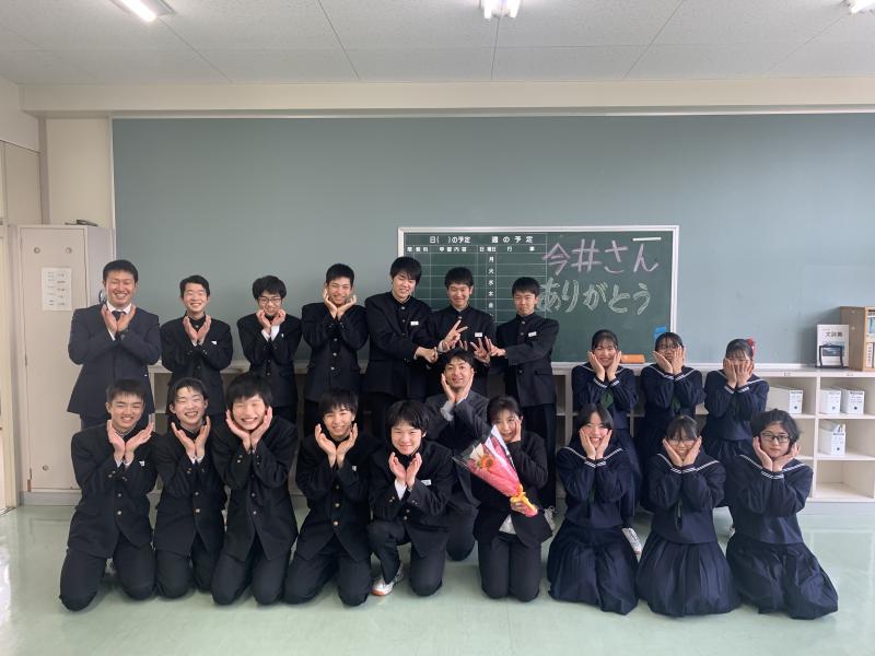 午後より離任式です。異動する職員一人ひとりの話の後、生徒から謝辞と花束贈呈がありました。式後には卒業生の皆さんからも異動する職員に色紙や花束を頂きました。お心遣い頂き誠にありがとうございます。職員も赴任地で精進することを子どもたちと約束していました。