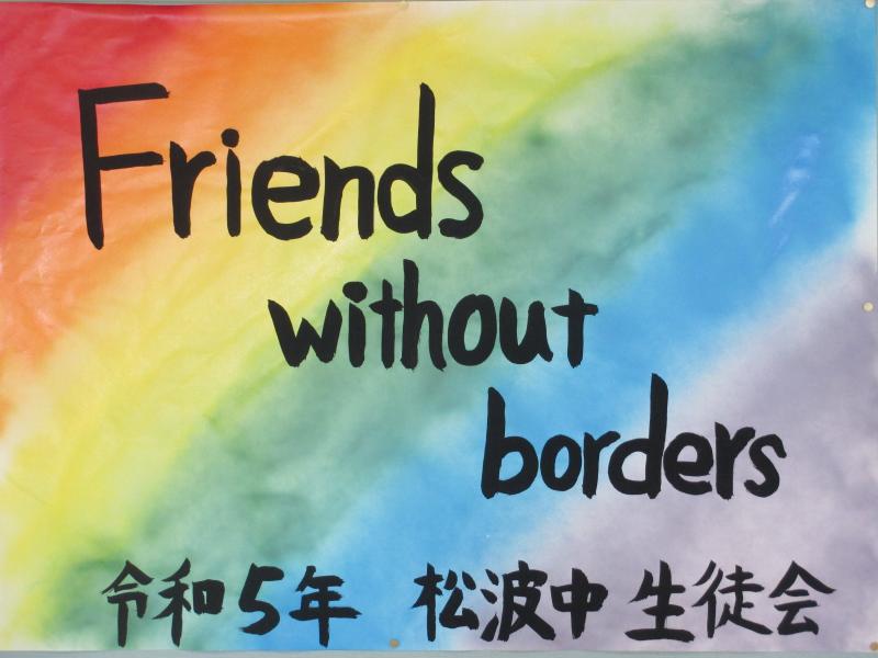 生徒総会の様子やホームページの冒頭でもお知らせしましたが、今年度の松波中学校生徒会スローガンは「Friends without borders」です。友達の間に境目がないという意味から、1~3年生みんなが友達でいることができるようにという思いが込められています。