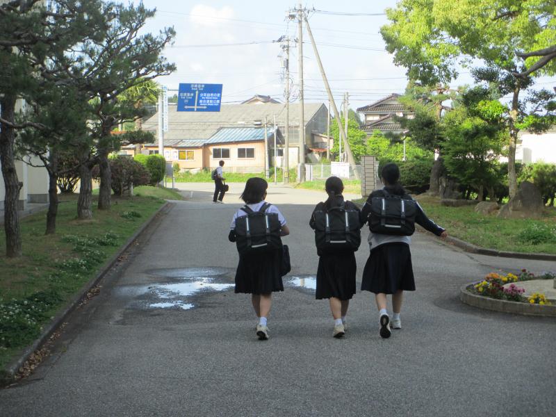 日中降っていた雨も下校時には上がり、日が差す中、生徒たちは下校していきました。朝方は曇りだったためか思いのほか自転車で下校する生徒も多かったです。写真では伝わりませんが、生徒たちの歩みに合わせてクマよけの鈴の音が響いています。