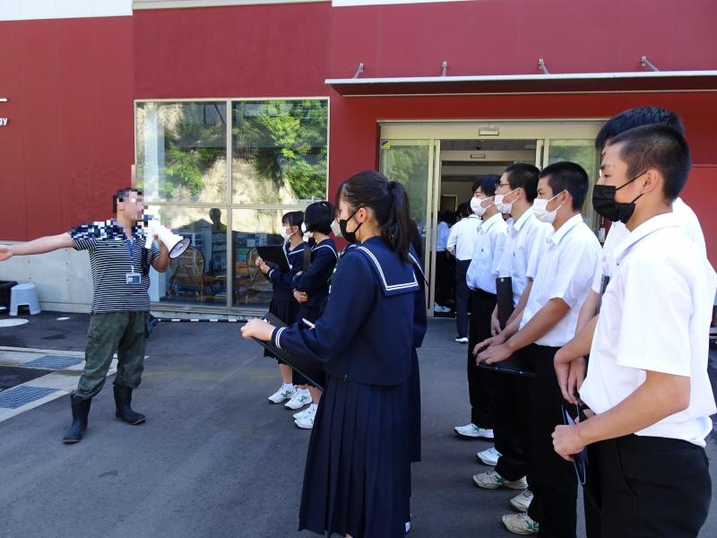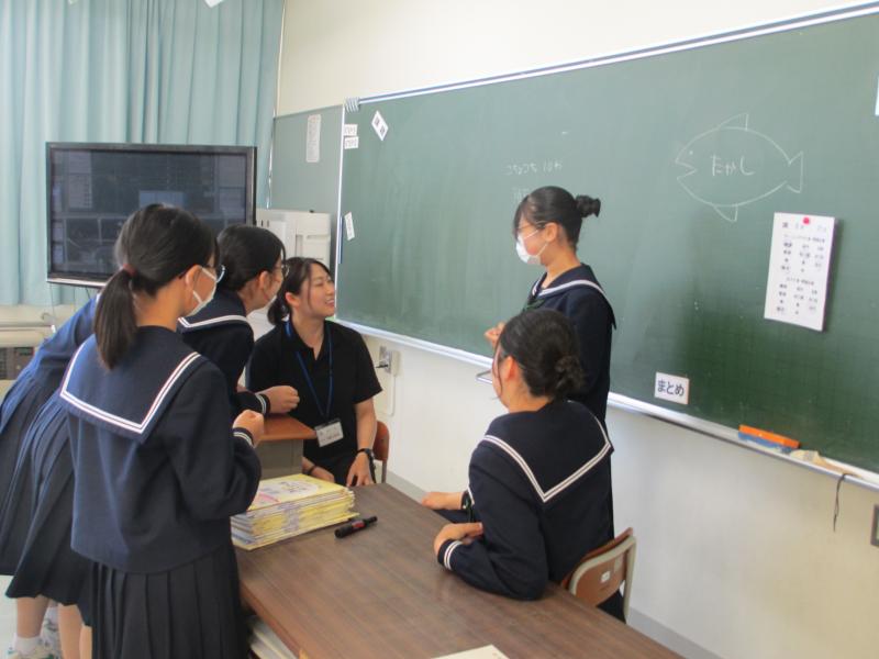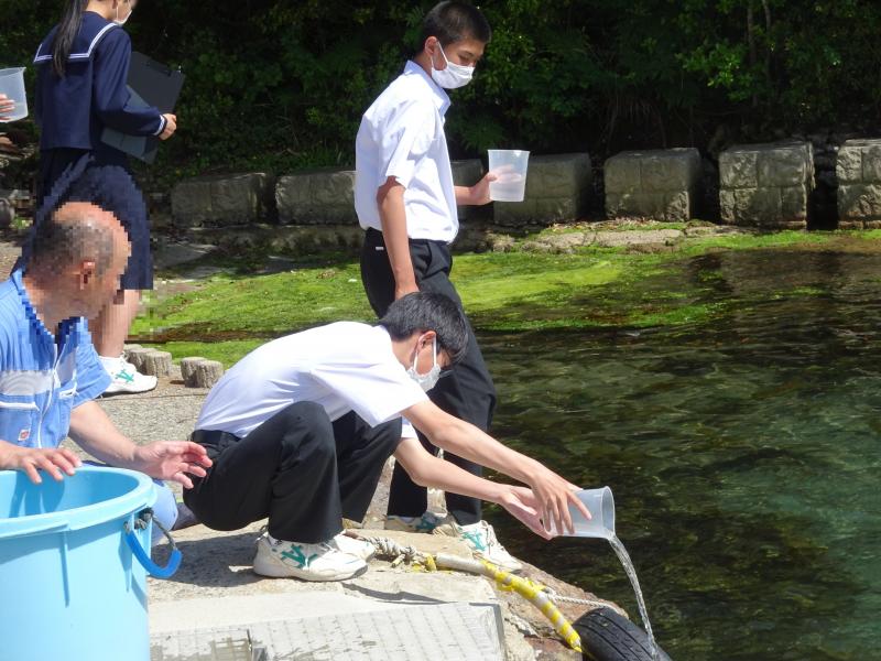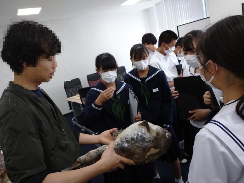 初めてサクラマスの養殖(ふ化から成育まで)に成功した同センターで、フグやサヨリの養殖や栽培漁業(稚魚を放流)の様子を見学し、実際にフグの稚魚放流も体験させていただきました。サクラマスについては病院食として活用されると報道もありましたが、松波中では一足早く今月11日に給食でフライにしていただきました。