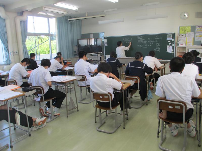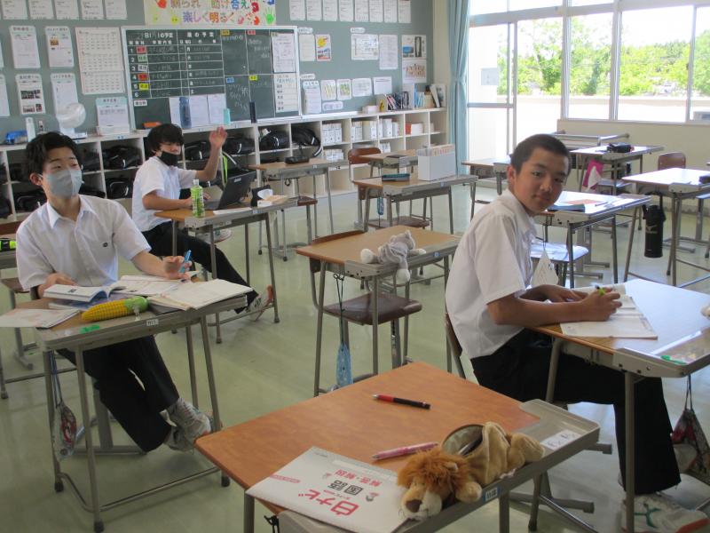昼休みの3年教室です。男子の多くは体育館へ行っており、数名が教室で真剣に宿題に取り組んでいました。女子は先生と軽いレクリエーション中のようです。昼そうじの後は、英語の授業でした。本日はテスト返し。問題を大きな声で読み返しながら、課題となったカ所の点検をしました。