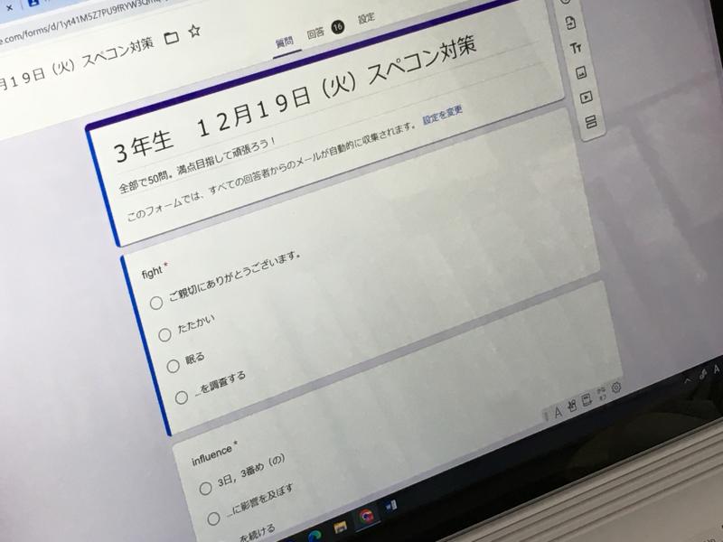 2学期もいよいよ最終日。生徒たちは町内統一の英語スペリングコンテストに挑戦しています。結果の確認は新年に持ちこしですが、練習期間の成果が表れるといいですね。