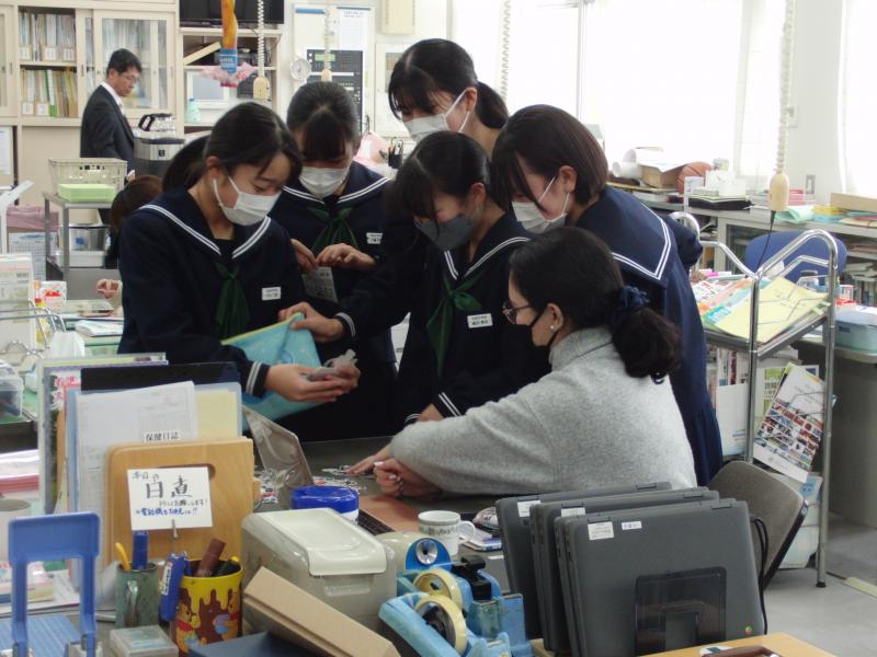 昼休みの職員室です。英語の時間、アクティビティ(活動)のご褒美にアニメキャラクターのステッカーをもらえたようです。授業で物足りなかった生徒たちが、ALTのエイミーさんにおねだりに来ていました。