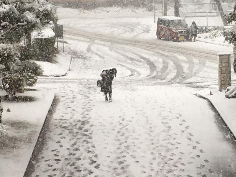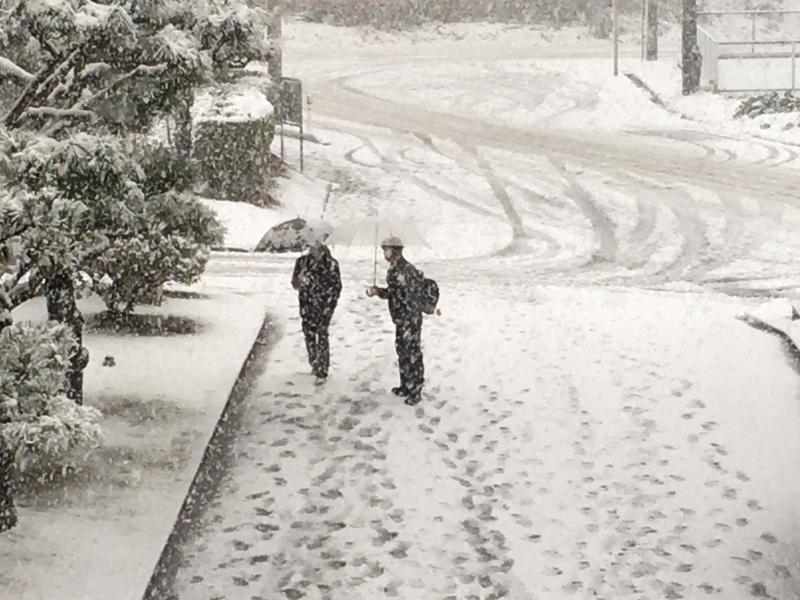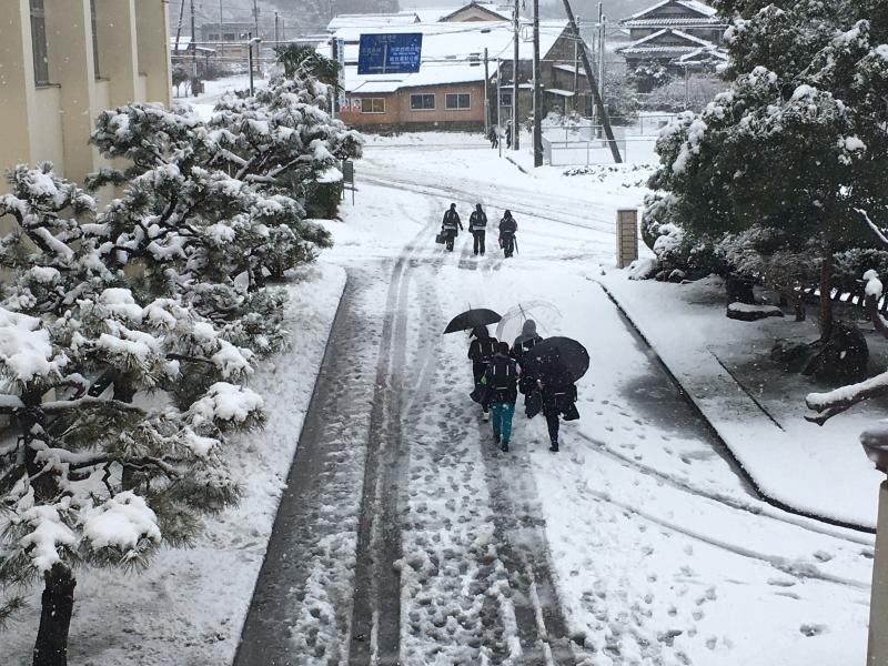 朝、生徒の登校の様子です。降雪のため、下を向いて歩く生徒が多いです。周りに気をつけて歩行してくださいね。それでも友達と一緒になると笑顔がこぼれるようです。