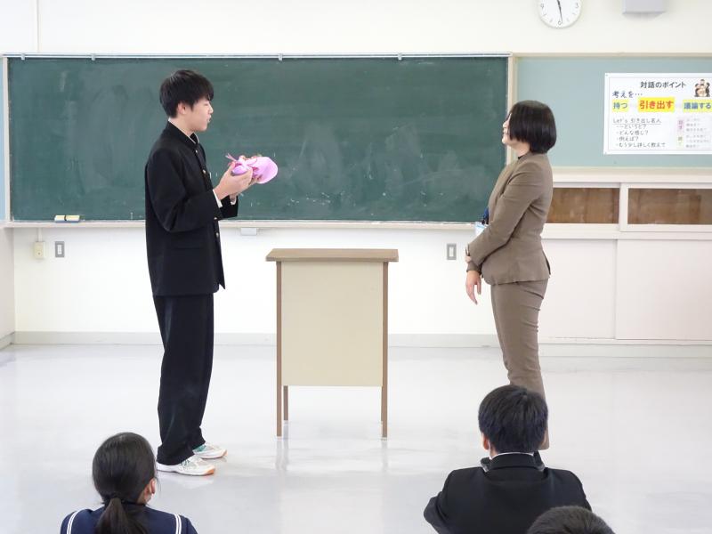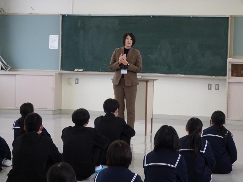 小畠先生からはあいさつの中で、「なんのために勉強するか。それは人を傷つけないためだ」とお話がありました。正しい言葉遣いを知ること、相手の背景を知ること等々がその人を傷つけないことにつながるのだ・・・。中学生たちは神妙な面持ちで、お別れの言葉を聞いていました。相撲部で先生にお世話になった3年又多壮志さんが生徒会を代表して花束を手渡し謝辞を述べました。小畠先生、9か月間ありがとうございました。
