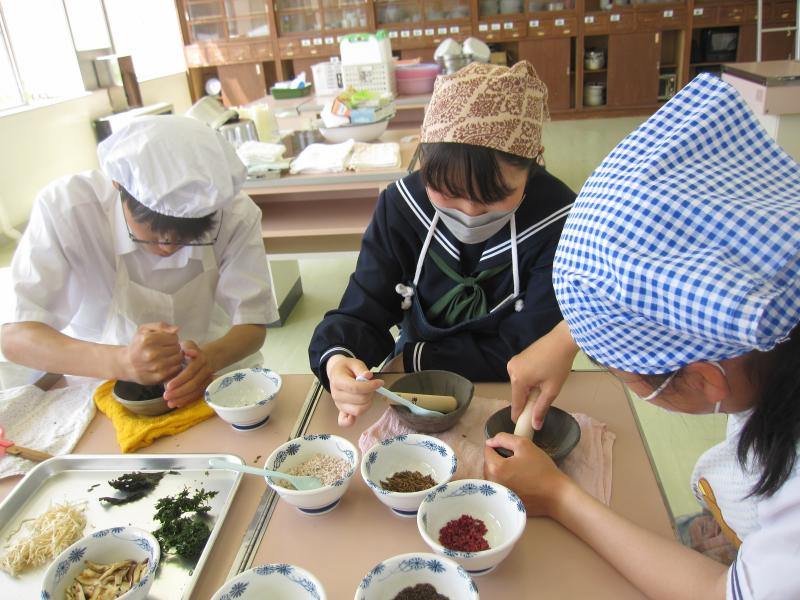3年生は海洋教育のテーマ「海を活用する」に沿って、今年もふりかけづくりに挑戦します。海産物を主材料として、オリジナルのふりかけを製作販売していきます。生徒たちは、能登の海をPRすることに加え、自分たちが頑張っている姿を発信することで、地域の皆さんを元気にしていきたいという思いを持っています。先日、能登里海研究所やフードコーディネーターの方と一緒に材料の組み合わせを考えました。実際に材料を細かくし、数種類混ぜ合わせ、試食してみました。それぞれのグループから提案がありましたが、多数決で一つの味に決まりました。今後は、パッケージデザインやPR方法とその内容について話し合っていきます。