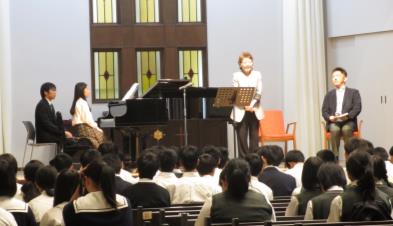 「音楽の木」です。前週は合唱部の3年生に披露し、緊張感の中で歌うことの大変さや、