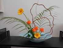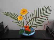 【感想】花を前や横に倒して生けたらいいことを学びました。SPクロトンを表じゃなくて裏を使って生けると紅アオイと同じ色になることがわかりました。  (ハタハタ)
