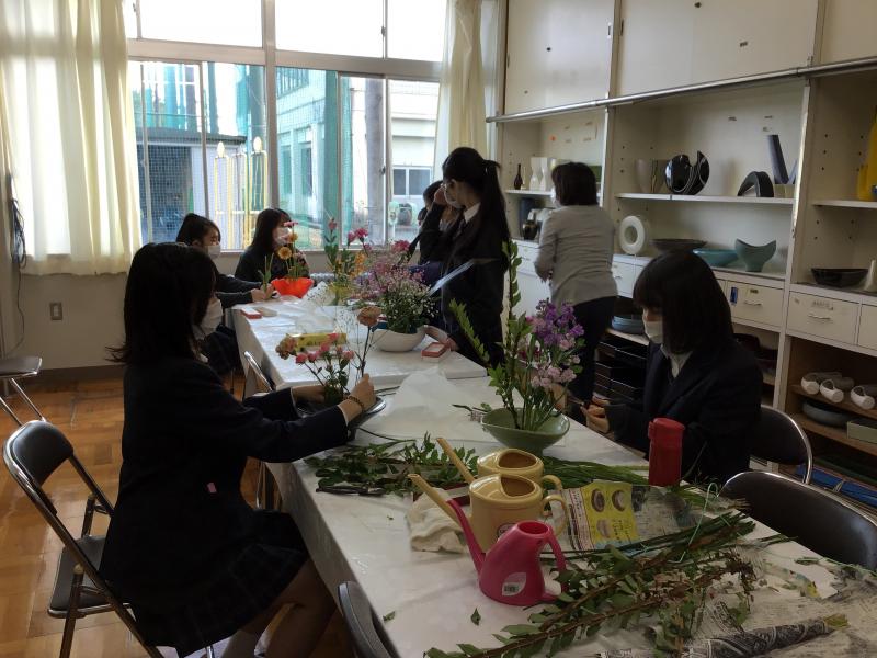 部員は2年生が5人という少人数ですが、思い思いの花器で生けてみました。