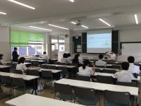 本校教員による「勉強法の伝授」も今回で3回目を迎え、今回は「英語」ということで、英語科の中先生が講義されました。「英語はことば(言語)である」という一言から始まり、時代とともに変化する言語の特徴を丁寧に説明されていました。その他、英語力を上げるための基礎づくりや定期考査・大学受験の勉強法について話されていました。また、受験に使える単語帳や参考書の紹介も大変参考になったと思います。