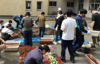 保護者、JRC部の生徒、教職員で、200の花苗をプランターに植えました。あいにくの雨模様でしたが、皆さん一生懸命に取り組みました。