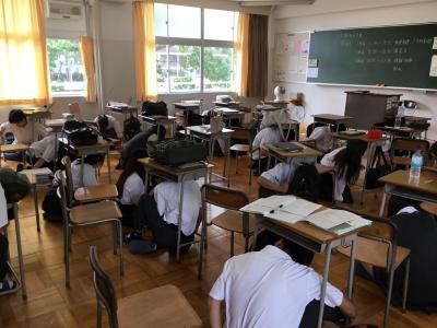2学期中間考査最終日、3限目に地震と火災を想定した避難訓練を実施しました。地震発生後の一分間の安全行動の後、アナウンスと先生の指示に従って全校生徒・職員が避難しました。避難途中には、防火扉が閉まった箇所もありましたが、臨機応変に速やかな行動を取ることができていました。