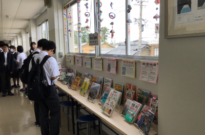 7月1日(火)~7月11日(金)は防災週間です。「防災について知ろう、備えよう」をテーマに、第1職員室前の廊下に防災関連の書籍コーナーができました。司書の下道先生が素敵に飾りつけをしてくださり、通る人の目を引いています。ぜひ本を手に取ってみてください。