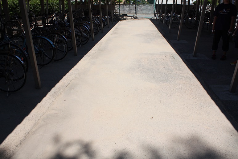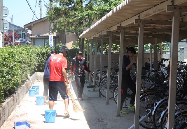 陸上部は先週で高校総体が終了したので、日ごろの感謝の意をこめて学校の駐輪場を清掃しました。4月の強風でグランドから大量の砂が駐輪場に飛散していましたが、先生も加わりきれいにしました。