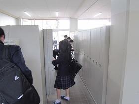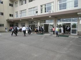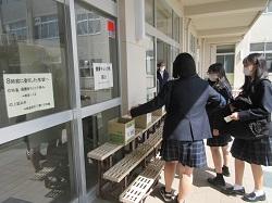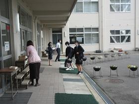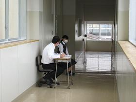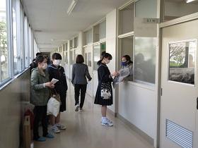 登校した生徒は、氏名や体温を書いた「健康確認チェックカード」を玄関前で提出し、中に入ります。カードや検温を忘れた生徒は、別室に移り検温しカードに記入した後教室に入ります。