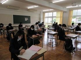 1,2限はロングホームを行い、3~5限は昼食を挟んで基礎力テストが行われました。いつもなら気の合う仲間と机を寄せて昼食をとるのですが、今日は机も動かさず自分の場所で全員が黒板の方を向いて無言で食べていました。かわいそうな気がしましたが、仕方がないような気もしました。6限目には再度ロングホームを行い放課となりました。部活動は6月4日(木)からの再開となります。