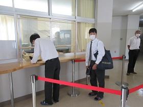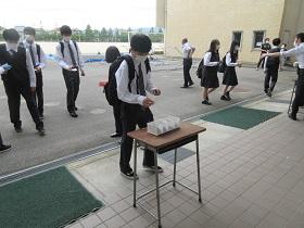 2年生の分散登校が本日行われました。昨日の3年生の登校と同じように、「健康チェック表」を提出し中に入ります。