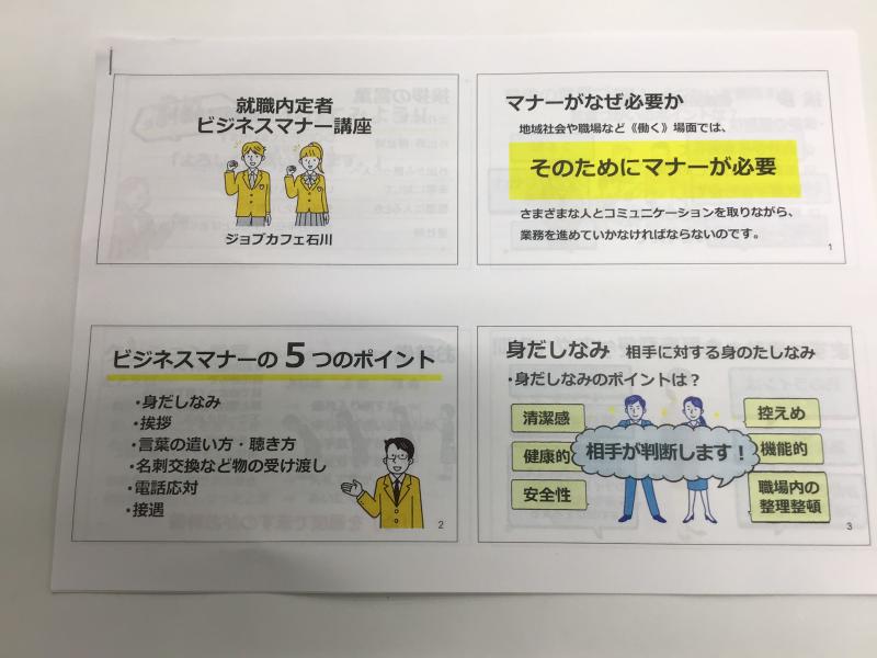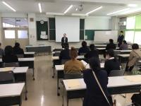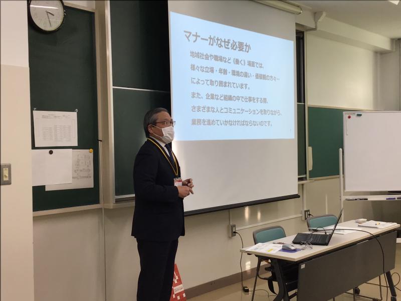 11月15日(水)7限に標記講座を実施しました。例年の恒例行事で「ジョブカフェいしかわ」の森田 浩様にマイクを握ってもらいました。ビジネスに求められるマナーや言葉遣い、態度についてお話しいただきました。会社に入れば、社会人として求められる態度と行動があります。自分のこととして意識して取り組むことが大切です。当たり前のことを当たり前にすることは難しいですが、意識して行動しましょう。次週はハローワークから学卒担当の方が来校し、ハローワークの立場から就職にあたって気をつけたいことをお話いただく予定です。内定をいただいた人は、「講師の方が何を伝えようとしているのか」を考え行動してほしいです。