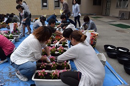 PTA花と緑の委員会による「第1回植栽事業」が6月3日(土)9:30より開催されました。吉田雅明PTA会長、北村幸恵校長、館山こずえ花と緑委員長をはじめ、保護者、生徒会や環境委員、教職員の約50名により、マリーゴールドやニチニチソウなど約300株の花苗が植えられました。約100個ほどのプランタは、野球部員が正面玄関や生徒玄関前に並べてくれました。今年は丸いプランタ10個も新たに作られました。