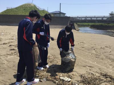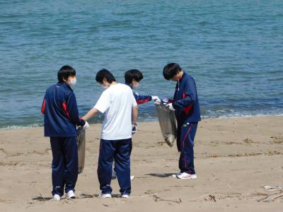 松任海浜公園では、海岸清掃を行い、生徒は海岸に落ちている