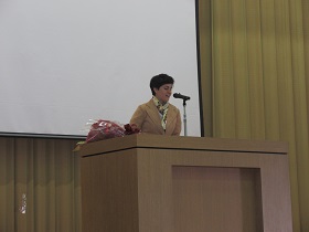 大谷さんは、俊足を生かすFWで、本校在籍時も「点取り屋」として得点王に輝きました。緊張した面持ちで挨拶をされた後は北村幸恵校長先生と談笑し、「後輩の励みとなるよう、がんばります」と意気込みを語られました。またサッカー部の後輩に向けては「最近あまり勝てていないようなので、上位進出に向けてがんばってほしい」とエールを送られました。