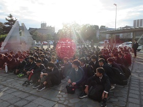 修学旅行第1日を終えました。京都から新幹線で博多まで移動し、福岡県の「大刀洗平和記念館」にて平和学習をして来ました。館内見学と映画、朗読会など生徒は真剣に話を聞き、数名感極まる生徒もいました。施設を出る際には「想像以上に酷いことなのだ」と言う生徒もいました。