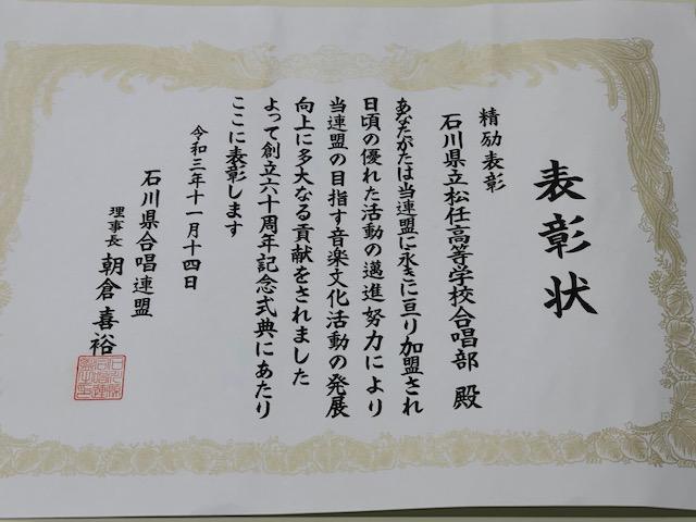 表彰されました! 投稿日時 : 2021/11/25 合唱部顧問 石川県合唱連盟より表彰状をいただきました。 現在の部員たちのがんばりはもちろん これまで熱心に活動してきた先輩方のおかげで このような栄誉をいただくことができました。 これを励みにこれからもがんばります! Tweet