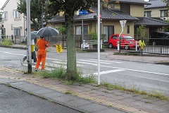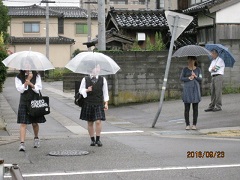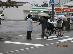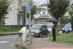 本日より本校の「第2回自転車マナー一斉指導」がスタートしました。台風16号の影響下の荒天の中、PTA生活指導委員や教職員が、7ヶ所にわかれ、7:50~8:20まで指導を行いました。雨脚の強い中、生徒たちは傘を両手でしっかりと持ち、風にあおられないよう登校していました。雨合羽を着ている生徒は良いのですが、傘をさして登校する生徒はズボンやスカートの裾を濡らしながらの冷たい登校風景となりました。この一斉指導は、祝日をはさんで23日(金)まで行われます。