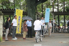 台風16号の雨も上がり、自転車マナー一斉指導が本日も行われました。今朝は雨に濡れることもなく登校が楽だったのではないでしょうか?ただ、耳にイヤホンをつけて通り過ぎる姿も目につく登校風景でした。