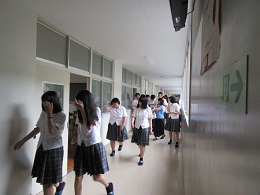 今年度の「災害避難訓練」を7月4日(火)7限後に実施しました。「地震発生後、1階ボイラー室から出火、延焼のおそれがあるため、第2体育館に避難する」という想定で行いました。生徒たちは、私語も少なく整然と避難できたように思います。講評で北村幸恵校長が「家や学校で災害に遭遇したとき、予め家族や友人に自分の所在を知らせておくこと」や「地域での自分の役割の確認をしておくこと」が大切であると話されました。