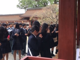 修学旅行第1日を終えました。京都から新幹線で博多まで移動し、福岡県の「大刀洗平和記念館」にて平和学習をして来ました。館内見学と映画、朗読会など生徒は真剣に話を聞き、数名感極まる生徒もいました。施設を出る際には「想像以上に酷いことなのだ」と言う生徒もいました。