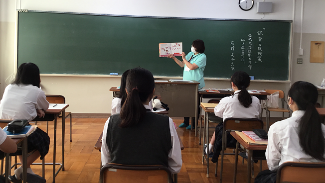 9月24日(金)に、家庭科の「子どもの発達と保育」科目で、金城大学短期大学部幼児教育学科の保育支援授業を受けました。この事業は今年で4年目になります。昨年度に引き続き、石野 友子先生にお越しいただきました。本校では、例年、近くの松任幼稚園に訪問して手作りの紙芝居を読み聞かせることをとおして、幼児とのコミュケーションを深める活動を続けています。そこで、今回も、紙芝居の制作にあたって、絵本との違いや演じ方の工夫について授業をしていただきました。