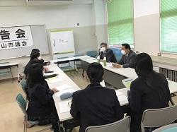 11/5(金)白山市議会議員さんが来校され、本校生徒と意見交換会を行う議会報告会が開催されました。今回のテーマは「議会や議員に対するイメージ」「住み続けたいと思うまちづくり」「自分たちがまちづくりに興味を持つためには」「どうすれば自分たちは投票にいくか」。生徒達は各々積極的に意見を述べていました。通学路の街灯についての要望については、意見交換会後に議員の方が詳細を聴き取ってくださいました。本校でも、生徒が自分たちで地域の未来を創る力を身に付ける教育を行っていきます。