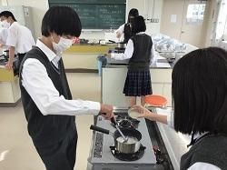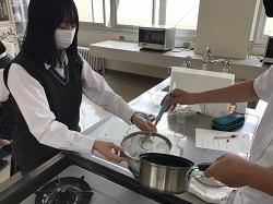 6/15(水)3限目の調理室の様子です。温めた牛乳にレモン汁を加えています。料理をしているのではなく、タンパク質の酸変性の観察実験です。牛乳に酸を加えると白い沈殿(カゼイン)と透明な液(ホエイ)に分かれることを観察しました。溶けていたタンパク質が酸で凝固するのを確かめました。
