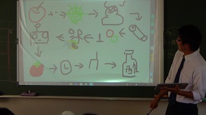 生徒たちのペア学習やグループ学習の解答をプロジェクターで映し、ピックアップ機能や