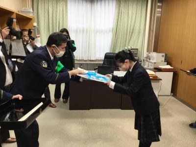 表彰を受けました。そのため、表彰式を校長室で行いました。表彰式では、生徒を代表して、