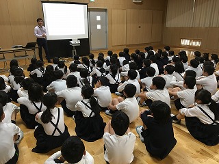 一覧へ 総合 ジオについての話を聞きました 投稿日時: 2018/05/08 先生 これから総合の学習でジオパークについて学習し、まとめ、全校児童に発表していきます。その第一歩として、ジオパーク・エコパーク推進室の方に、ジオパークのことを教えてもらいました。子どもたちは真剣に話を聞き、調べ学習に行くことを楽しみにしている様子でした。