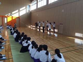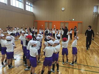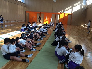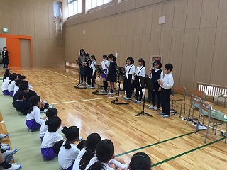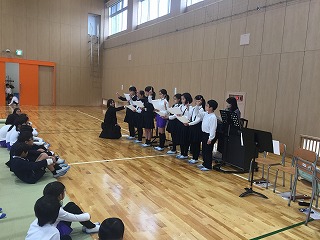 4・6年生は第二体育館でお互いの歌声を聴き合い、交流し
