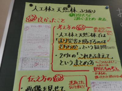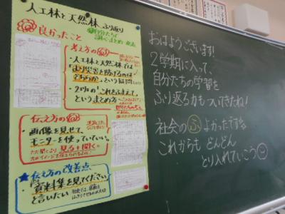 5年生では社会科で調べ学習に取り組みました。学習全体を通して、考え方や伝え方の成果や今後の課題を振り返りました。先生はそのポイントを褒め、広げてくれています。見通す力と振り返る力は主体的な学びに必要な大切な力です。