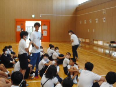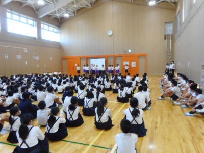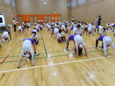 6年生では運動会に向けて「団体演技」の学年集会を行いました。団体演技の実行委員会のメンバーが中心となって、テーマや頑張っていくことを確認し合いました。「5年生の見本になり引っ張っていきたい」など、多くの前向きな気持ちが発表されました。写真のブリッジはほんのお試し。10月から練習は本格化します。がんばって!